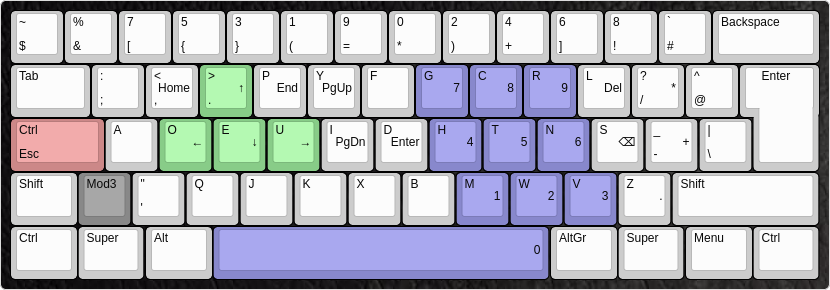 Remember that this keyboard layout offers comfortably reachable arrow-keys too, although hjkl is still preferable in vim since a mod key isn’t needed.