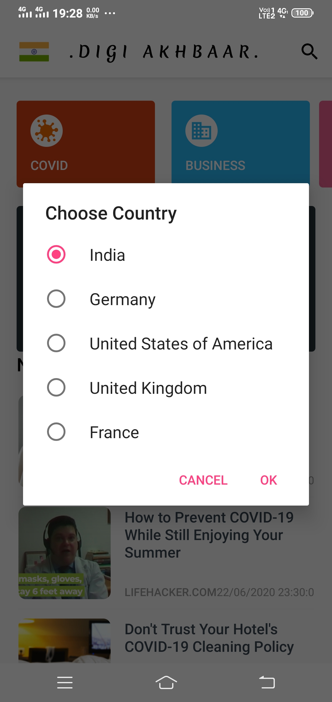 2.) Five different countries’ news is currently available in the app. The countries are India, Germany, the USA, the UK, and France.