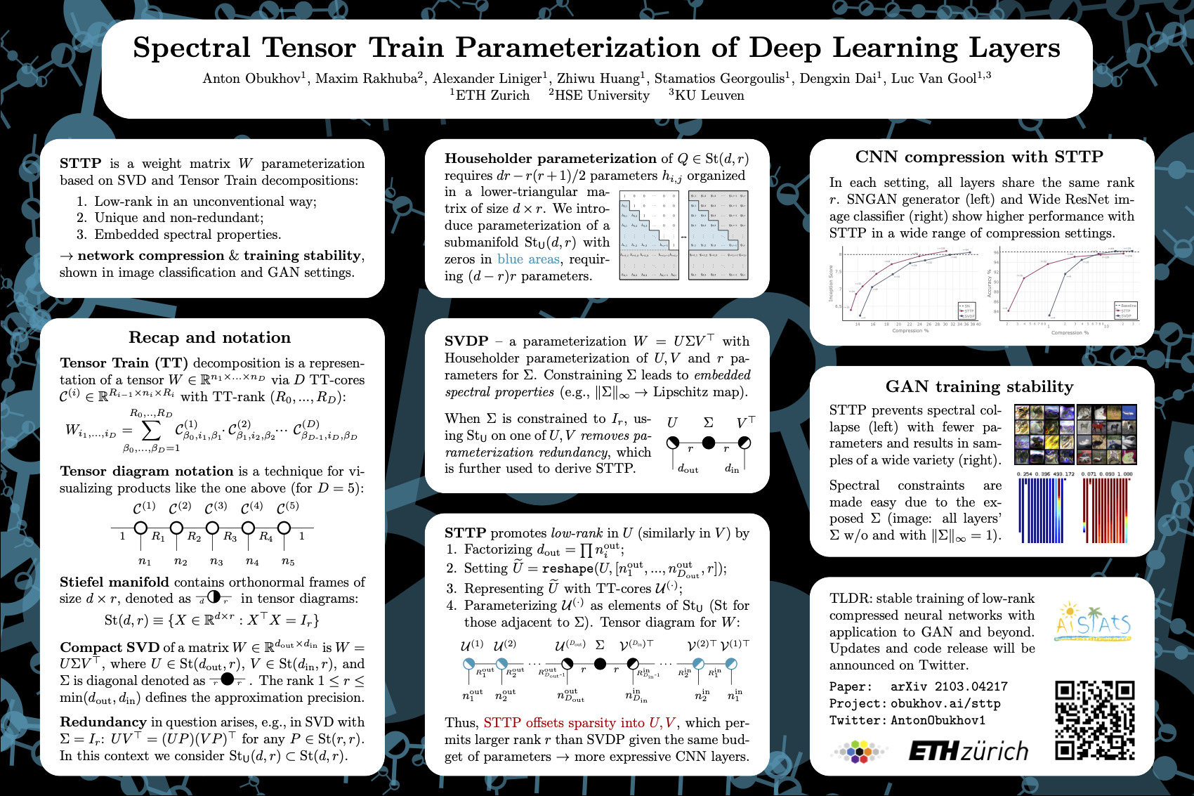 This repository is the official implementation of our AISTATS 2021 paper titled “Spectral Tensor Train Parameterization of Deep Learning Layers” by Anton Obukhov, Maxim Rakhuba, Alexander Liniger, Zhiwu Huang, Stamatios Georgoulis, Dengxin Dai, and Luc Van Gool [arXiv] [PMLR].